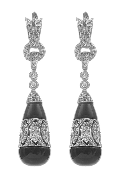 A PAIR OF ONYX AND DIAMOND DROP EARRINGS