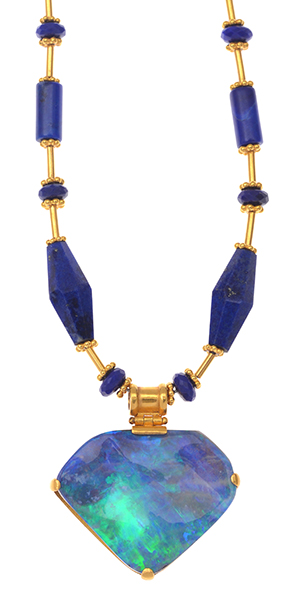 The free form bolder opal suspended from a lapis lazuli and gold collar, total length 480mm, all in 18ct gold.
