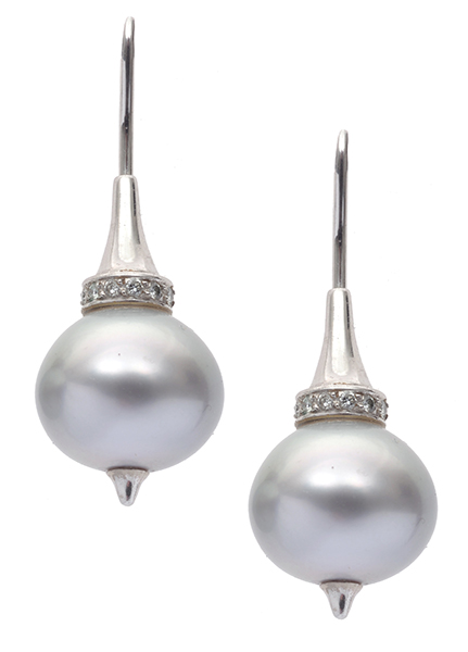 Each drop set with a pearl of silver hue measuring 12.10mm, surmounted by a circlet of diamonds to hook fittings, in 18ct white gold.