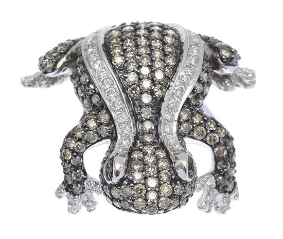 Modelled as a frog, the body set with cognac and white diamonds and ruby eyes, in 14ct white gold.