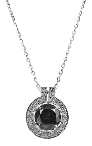 The round brilliant cut black diamond weighing 8.20cts encircled by white diamonds totalling 1.20cts to a fine chain, all in 18ct white gold.