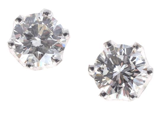 Each round brilliant cut diamond weighing 1.05cts, to screw post and clip fittings, in 18ct white gold.