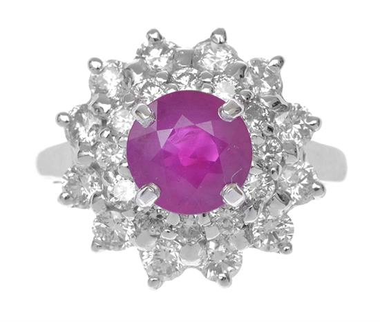 Centrally set with a round Burmese ruby weighing 1.67cts, surrounded by two rows of round brilliant cut diamonds weighing 1.90cts, in 18ct white gold, ring size L-M.