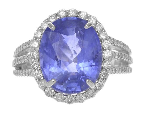 Centrally set with an oval cut sapphire weighing 7.57cts, with round brilliant cut diamonds to the surround and shoulders totalling 1.03cts, in 18ct white gold, accompanied by a SGS certificate, ring size M.