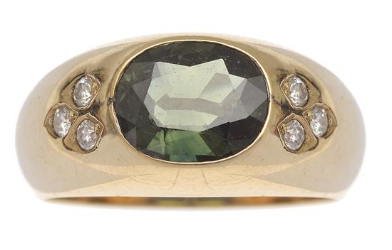 The oval green sapphire horizontally bezel set with three diamonds to either side, in 18ct gold, ring size P.