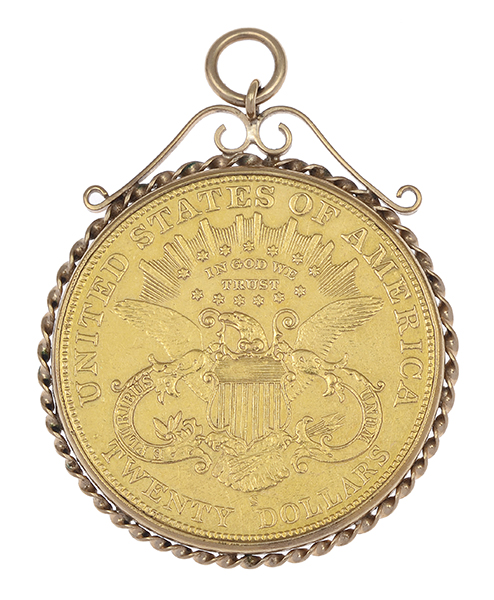 Featuring a United States of America, 1906 twenty dollar coin, total weight 36.68gms, mounted in a rope twist frame in 18ct gold.