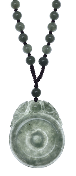 The carved disc suspended from polished beads and knotted silk thread.