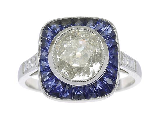 The cushion cut natural vivd royal blue sapphire weighing 5.09cts, flanked by a trilliant diamonds totalling 1.41cts, in 18ct gold, a