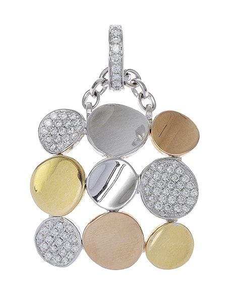 Of disc design, comprising earrings, ring and pendant, in 18ct tri-coloured gold, ring size N.