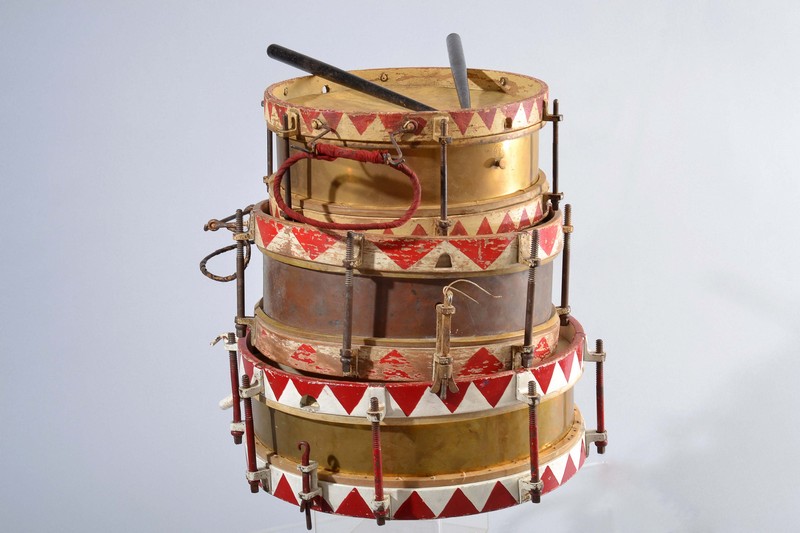 DRUMS - THREE EARLY 20TH CENTURY GRADTUATED MARCHING BAND DRUMS.