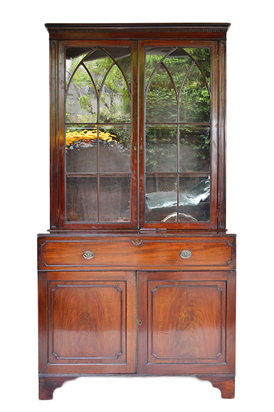 the astragal glazed upper doors with Gothic arched glazing bars, above a secretaire drawer and two panelled doors, bracket feet, 124.5 x 243 x 59cm