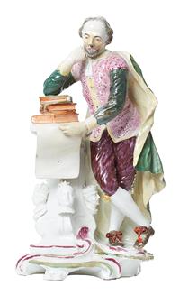 Typically modelled standing alongside a plinth with applied masks of Richard II, Elizabeth I and Henry V, resting his elbow on books which secure a scroll, on a rocaille scroll base with gilt highlights, restored, 30cm high.