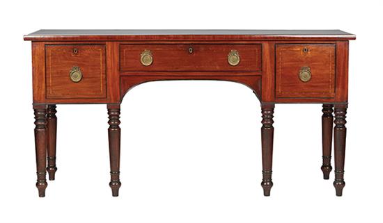 With rectangular top, the central baise lined sectional drawer flanked by cupboard door enclosing secret side pot cupboard and a converted cellarette drawer, all with satinwood feather banding, ebony stringing and brass ribbon and ring handles supported on turned legs, 184.5cm width x 59.5cm depth x 90cm height.
