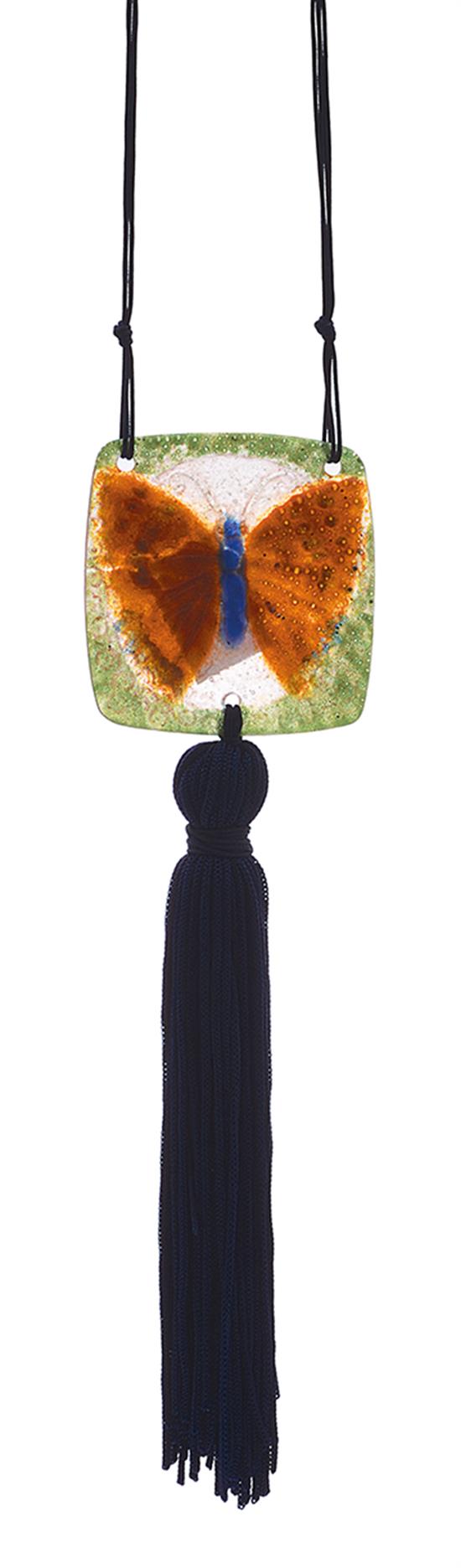 The butterfly design in green, orange and blue, to blue tassel and chording, signed.