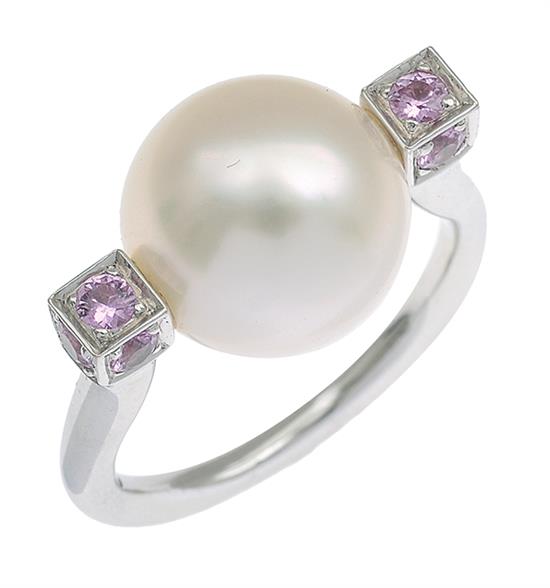 From the 'Ethereal Luna' collection, centrally set with a round pearl of silver white hue measuring 11-12mm, with eight round brilliant cut pink sapphires totalling 0.60cts, in 18ct white gold, boxed.