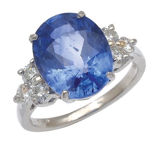 Centrally set with an oval cut sapphire of 7.57cts, flanked by round brilliant cut diamond set shoulders, mounted in platinum, ring size N-O.
