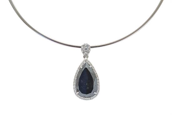 The pear cut diamond of 16.49cts, surrounded by round brilliant cut white diamonds and diamond set bale, suspended from an omega collar, all in 18ct white gold, with IGI diamond report..