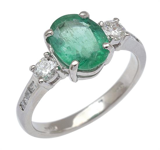 Centrally set with an oval cut emerald of 2.03cts, flanked by round brilliant cut diamond set shoulders totalling 0.42ct, mounted in platinum, ring size O-P.