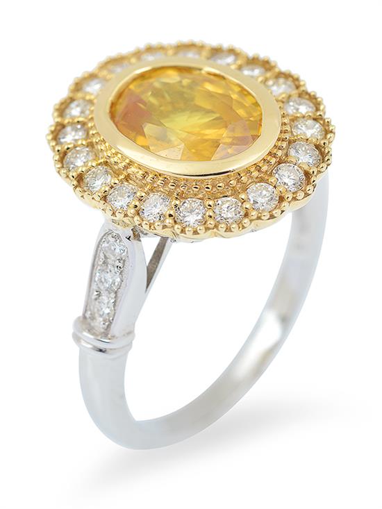 A GOLDEN SAPPHIRE AND DIAMOND CLUSTER RING