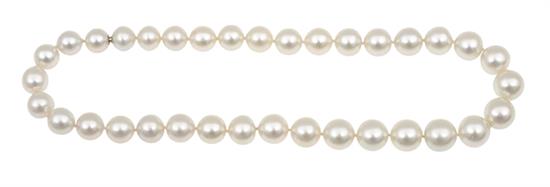 The graduated round pearls of silver white hues measuring 10.3mm to 13.0mm, to an invisible clasp, total length 425mm.