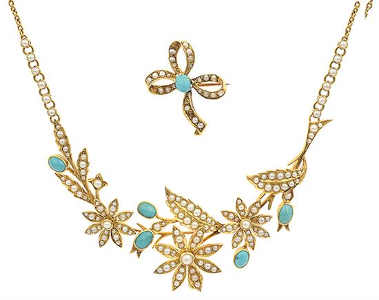 Featuring flowers and leaves set with pearls and accentuated by turquoise, together with a bow brooch of similar decoration both in 15ct gold.