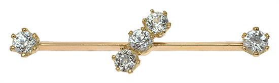 Featuring three old European cut white sapphires, diagonally set on a bar terminating with a further sapphire to each end, set in 15ct gold.