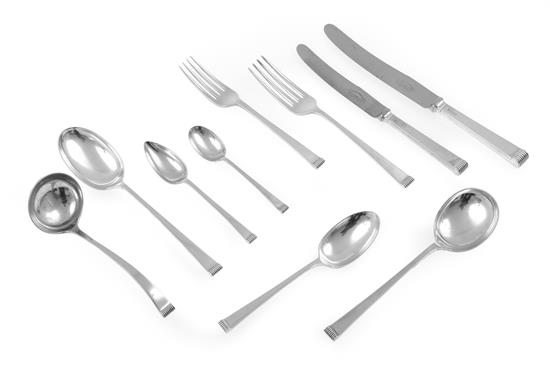 comprising twelve large dinner forks, twelve dinner knives, eight entree forks, twelve entree knives, twelve soup spoons, twelve dessert spoons, nine teaspoons, eleven fruit spoons, six serving spoons and one ladle, 3846 grs total weight of silver, excluding knives with stainless steel blades, (95)