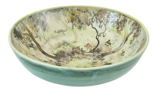the hand painted bowl incised Arthur Merric Boyd and hand painted 'Neil Douglas / Morning in the gum forest ' to base, 22.5cm diameter (restored)