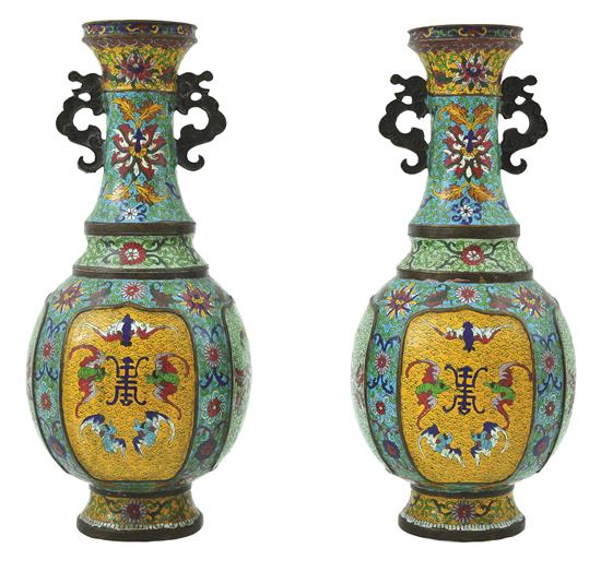 the tall vases with vibrant enamel design, each with four panels to the rounded body, two sides depicting the auspicious design of five bats on a yellow background with the shou symbol for longevity, the other two panels illustrating a floral pattern on a mint green background, with dragon handles, 50cm high (a few chips to the surface and minor loss in sections to the enamel consistent with wear)