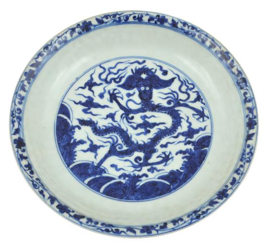 A CHINESE BLUE AND WHITE DRAGON DISH, JIAJING MARK