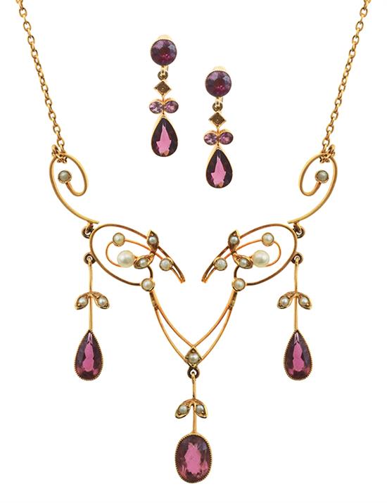 The necklace with fine scroll frame set with pink tourmalines and seed pearls, in 15ct gold, the earrings of conforming design.
