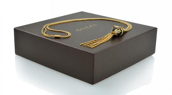 Styled with a panthers head in cream and black enamel, to a fancy link gilt chain, with box.