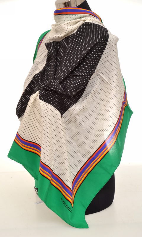 Styled with a spot pattern in black and white with a multi coloured border, 86cm square.