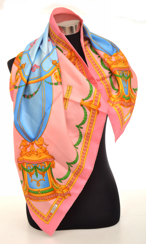 The 'Danish Jubilee' design in blue and gold on a pale pink background, 89cm square.