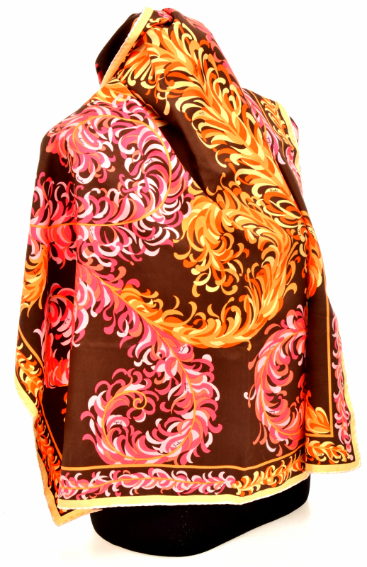 Styled with a floral design in autumnul colours on a brown background, 89cm square.