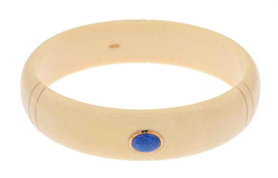The ivory bangle set with lapis lazuli cut en cabochon with inlaid 14ct gold decoration.