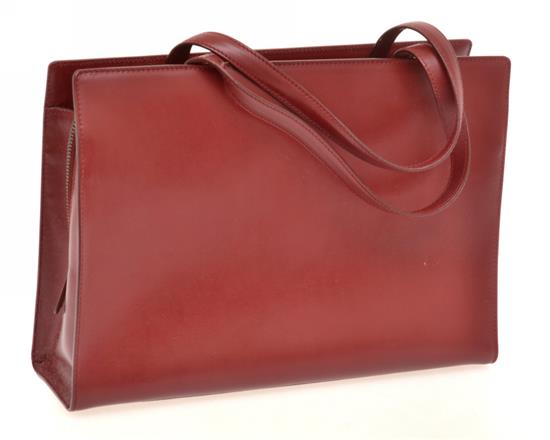 Styled in burgundy leather with burgundy leather handles, 30 x 21 x 8.5cm.