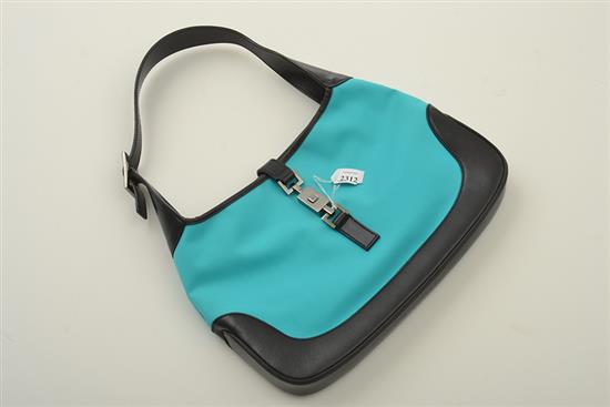 Styled in turquoise canvas with black leather trim and silver metal hardware, 0013306-3444, 32 x 21 x 3.5cm.