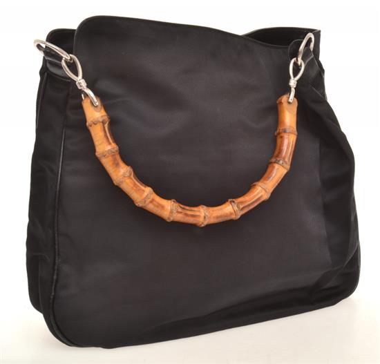 Styled in black canvas with bamboo handle, black leather trim and silver metal hardware, 0011577-2615, 38 x 33 x 10cm.