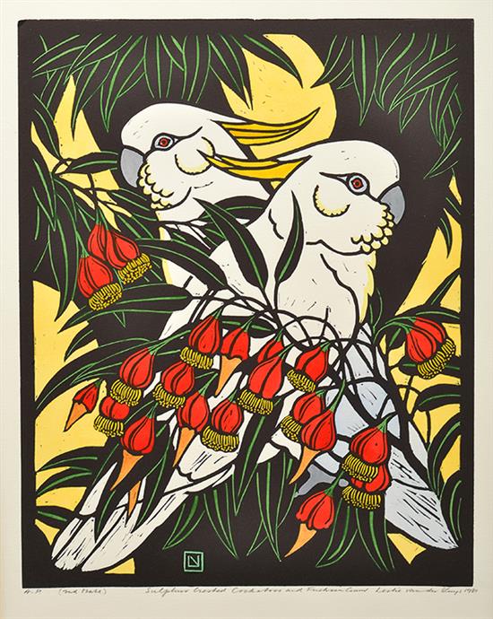 LESLIE VAN DER SLUYS (1939-2010) Red Wattlebirds and Banksia Attermata 1982 hand coloured linocut 64/80