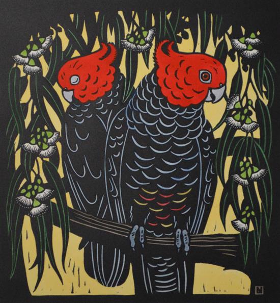LESLIE VAN DER SLUYS (1939-2010) Sulphur Crested Cockatoos and Fuschia Gum 1981 hand coloured linocut A/P (2nd state)