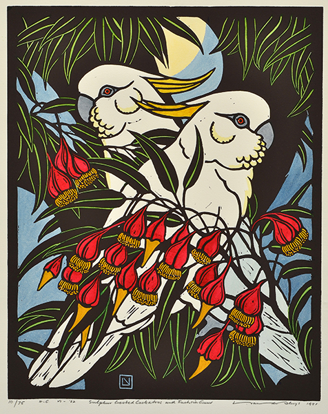 LESLIE VAN DER SLUYS (1939-2010) Red Tailed Black Cockatoos and Banksia Serrata 1980 hand-coloured linocut 50/65