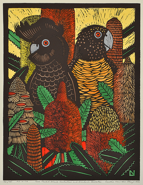 LESLIE VAN DER SLUYS (1939-2010) Glossy Black Cockatoo and Casuarina 1980 hand-coloured linocut 17/65