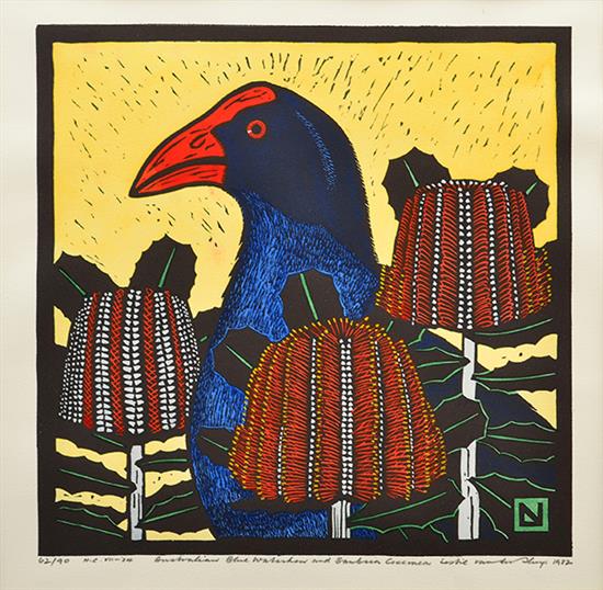 LESLIE VAN DER SLUYS (1939-2010) Kookaburra and Waratah 1983 hand coloured linocut 13/90