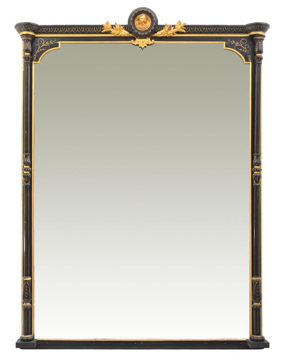 AN IMPRESSIVE VICTORIAN GILT AND EBONISED OVERMANTEL MIRROR