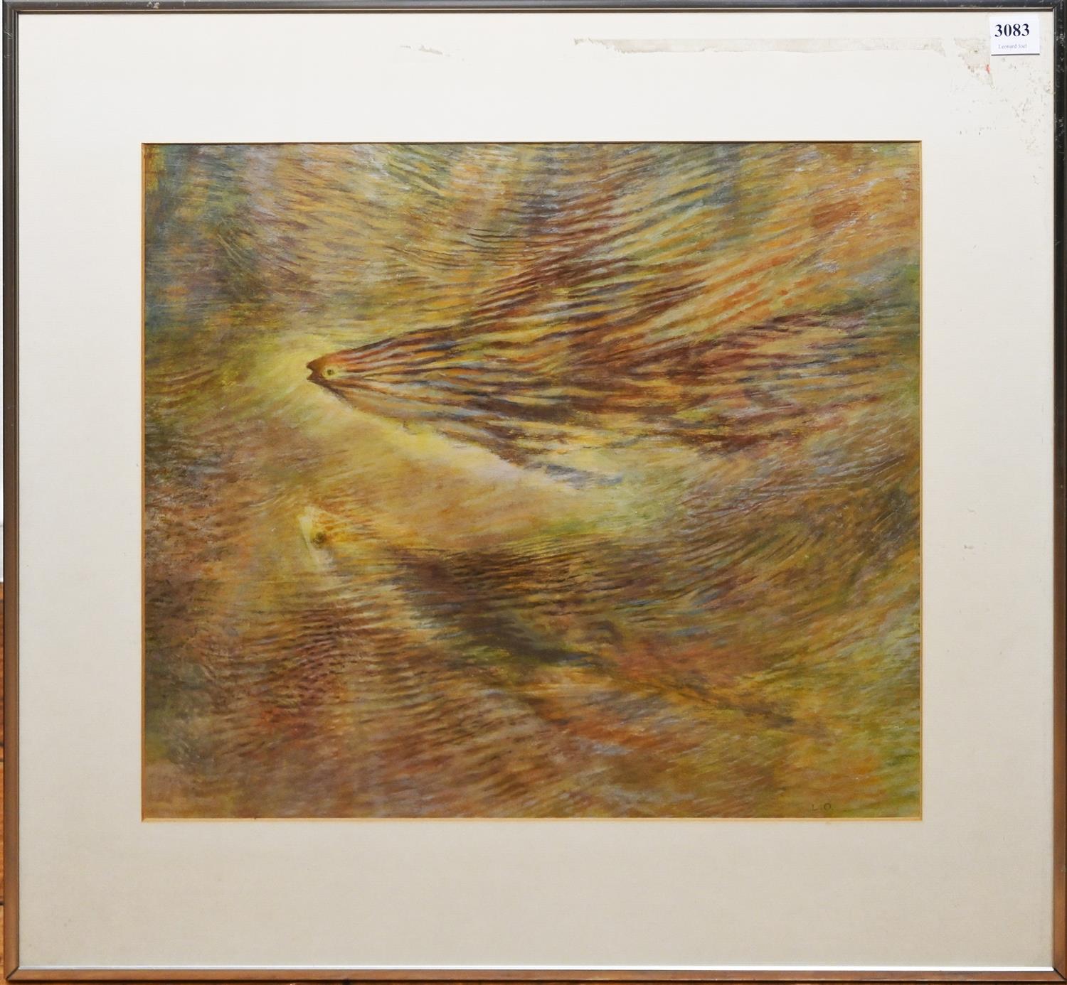 SIGNED L.O, FISH IN A POND, MIXED MEDIA ON PAPER