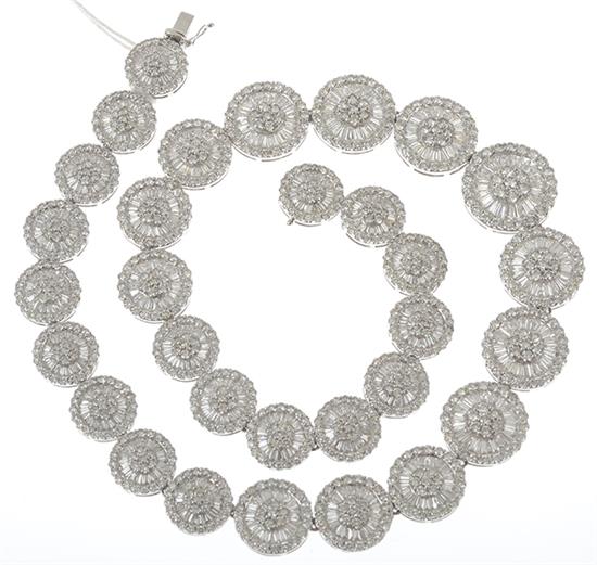 Featuring thirty one graduated roundels set with round and baguette cut diamonds, total diamond weight 36.40cts, mounted in 18ct white gold, total length 460mm.