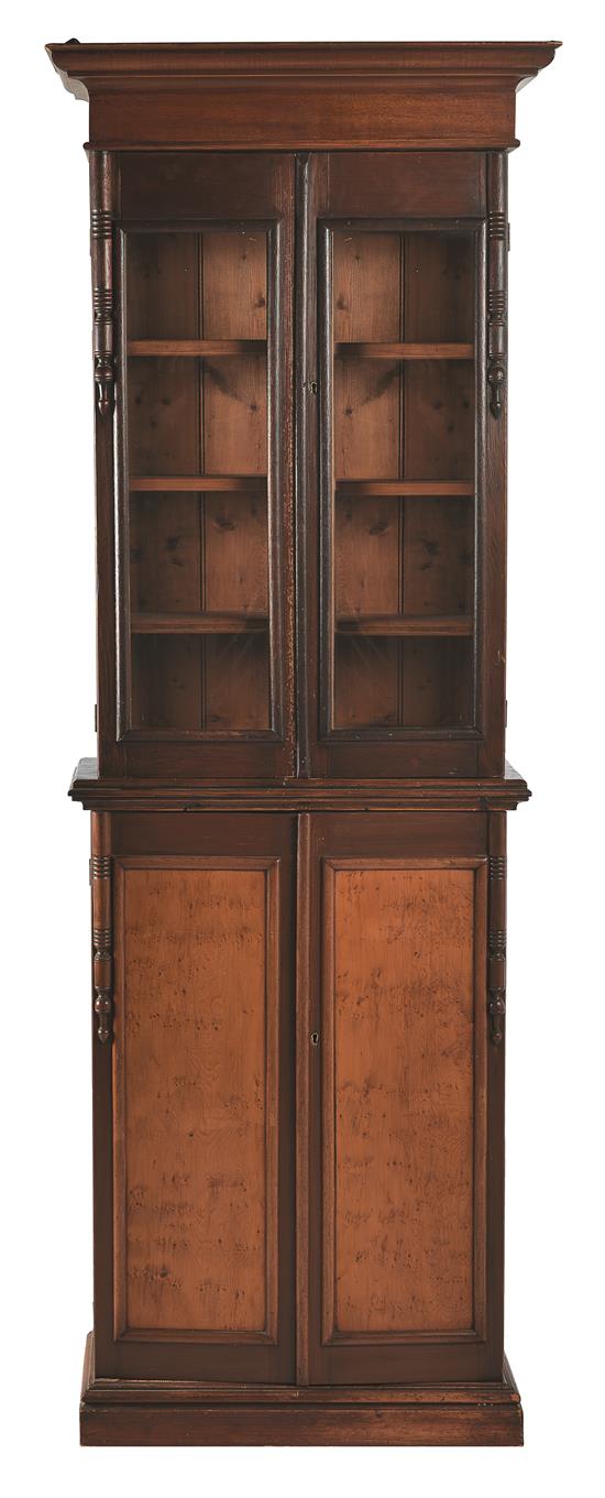 with a projecting cornice, above two glazed panelled doors, the lower section with two solid doors inset with Huon pine veneered panels, plinth base, 77.5 x 222 x 34cm