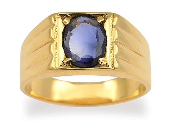 The oval cut sapphire of 4.97cts, mounted in 22ct gold, ring size U.