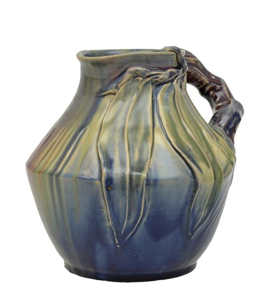 glazed in green, purple and red tones, with stylised branch handle and three applied gum leaves, incised Remued to base